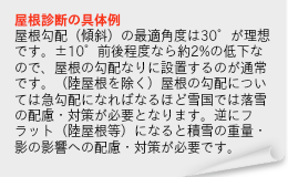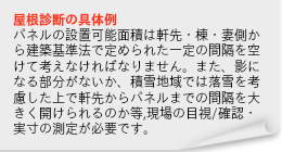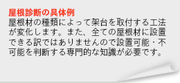 工事の際に、屋根に足場が必要かどうかを確認し、また、工事車両の出入りが可能かどうか、さらには、雪などが積もった場合の落雪なども確認します。落雪はとくに注意が必要です。パネルに積もった雪は落雪しやすく、車の上に落ち、車が痛んだり、隣の家に落ちたりなど、トラブルの原因になります。